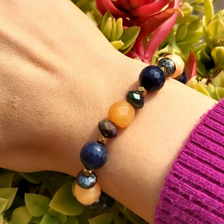 این دستبند کشی میباشد و از مهره های سنگ برنگ سورمه ای و نارنجی و هفت رنگ و طلایی تهیه شده است قابل ست کردن با رنگ لباستان مناسب جهت هدیه دادن