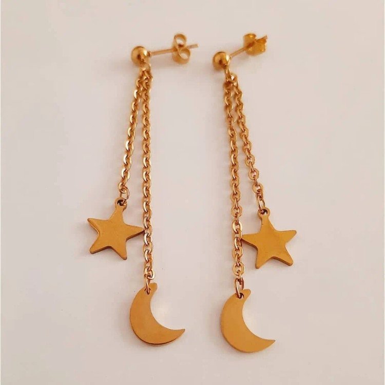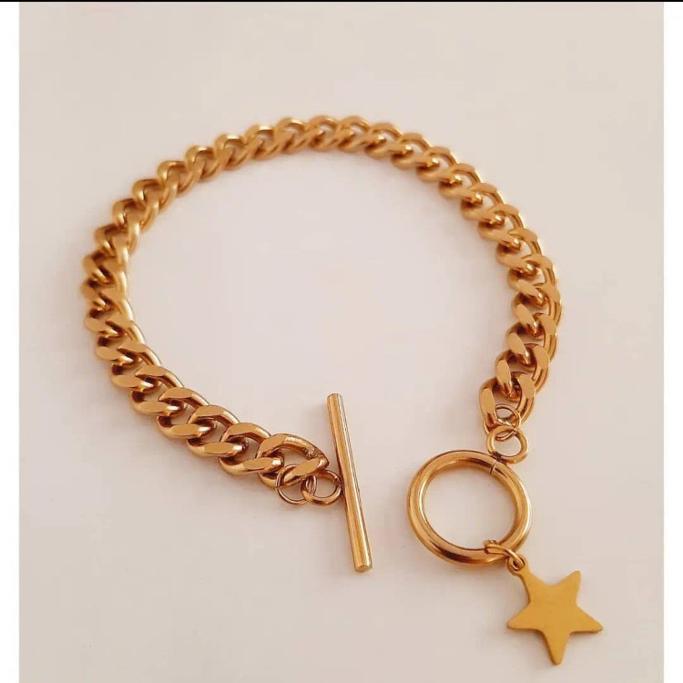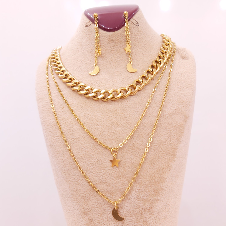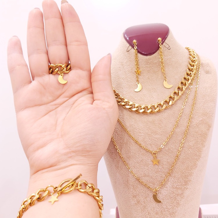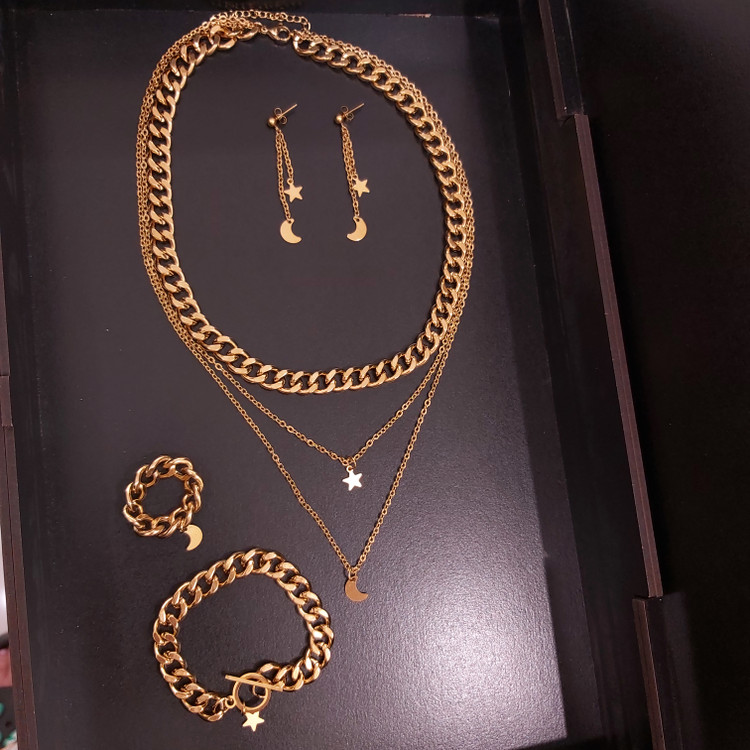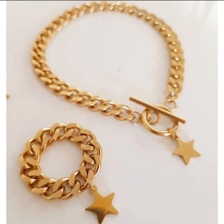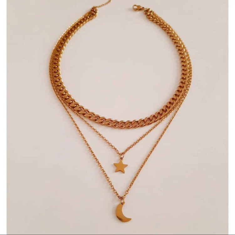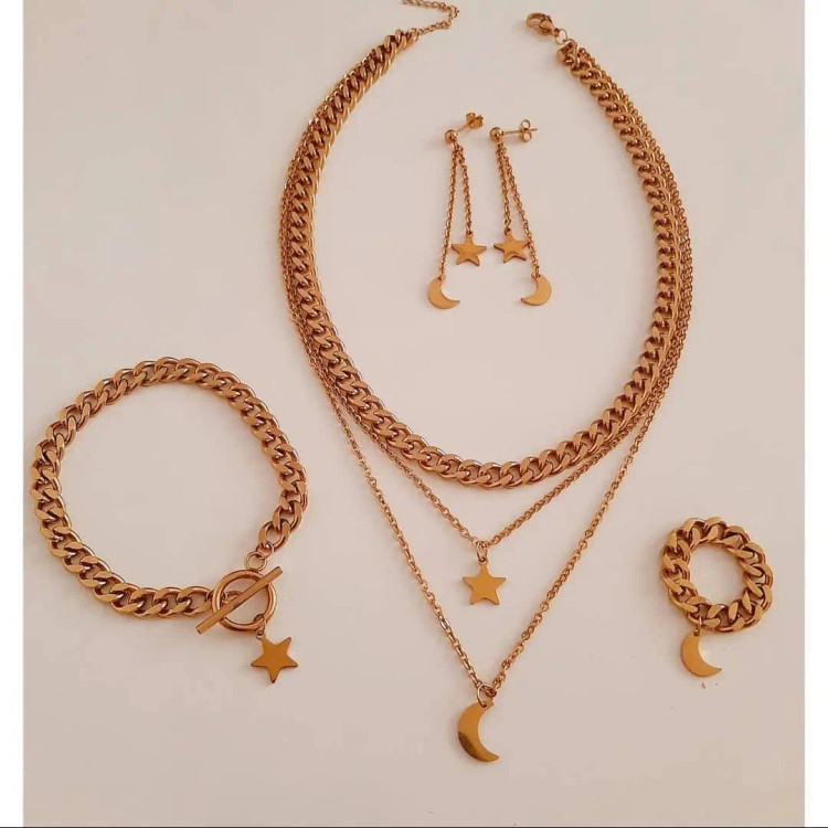 سرویس از کارتیر استیل و زنجیر دیپلمات⛓ و پلاک های ماه و ستاره قفل و حلقه و اتصالات استیل درجه یک درست شده است که کاملا رنگ ثابت میباشد 💯 ⚜ سایز کارتیر ۱\u002F۸ میباشد و ضخامت ۷ میل ⚜ گردنبند بصورت سه لایه با آویز ماه و ستاره ⚜ دستبند هم قفل تی دارد