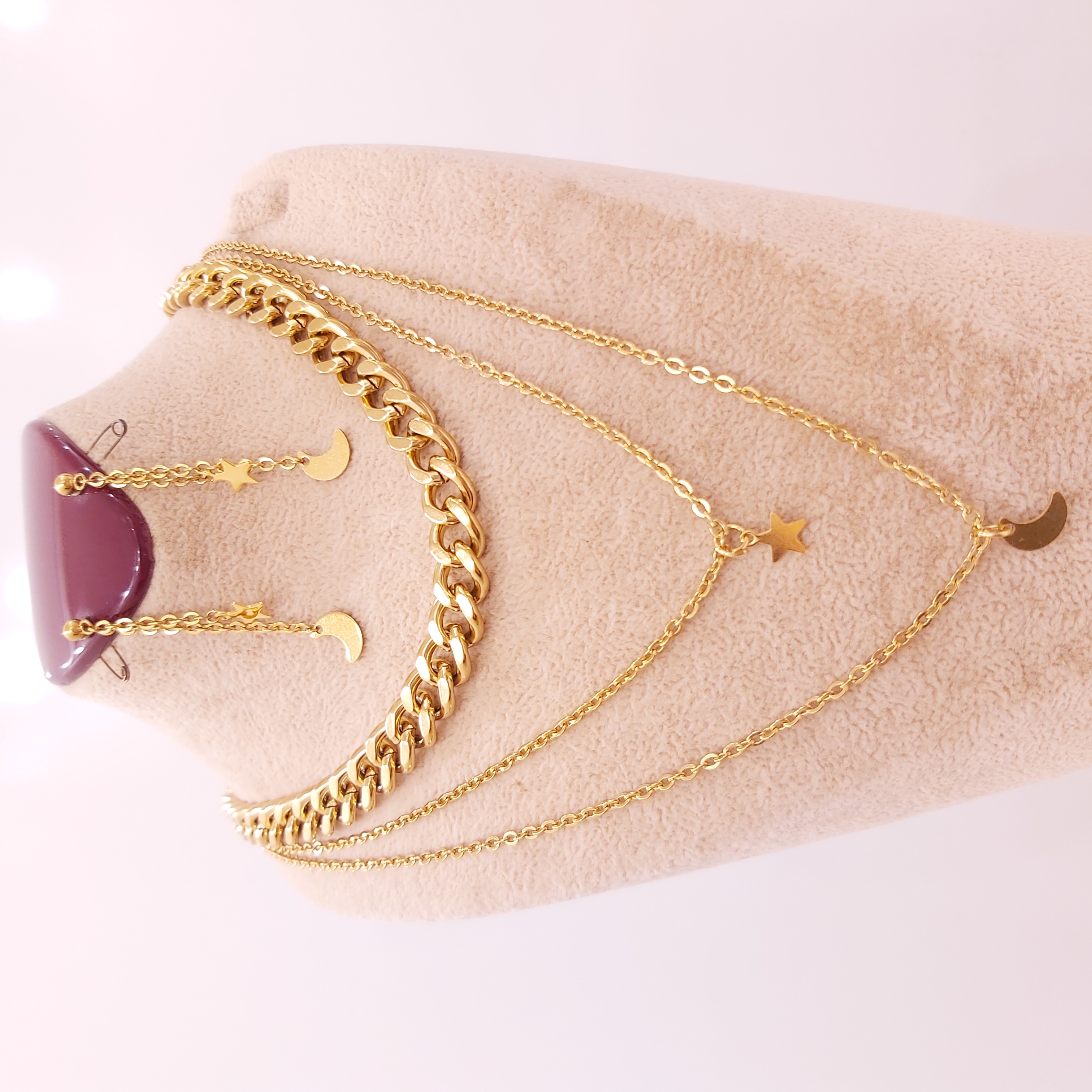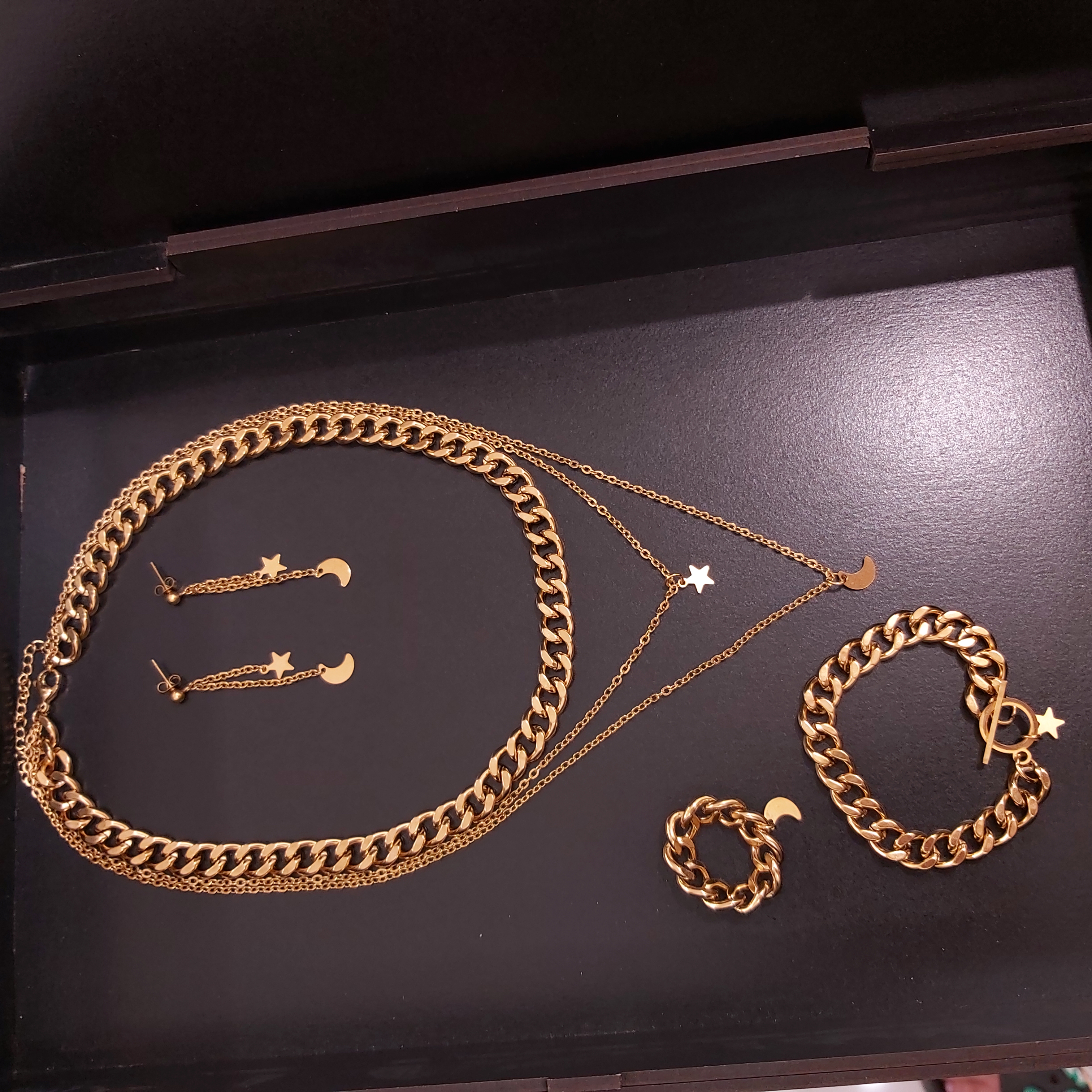 سرویس از کارتیر استیل و زنجیر دیپلمات⛓ و پلاک های ماه و ستاره قفل و حلقه و اتصالات استیل درجه یک درست شده است که کاملا رنگ ثابت میباشد 💯 ⚜ سایز کارتیر ۱\u002F۸ میباشد و ضخامت ۷ میل ⚜ گردنبند بصورت سه لایه با آویز ماه و ستاره ⚜ دستبند هم قفل تی دارد