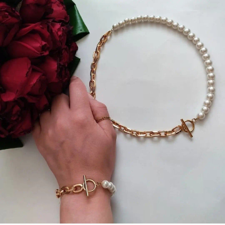 ست گردنبند و دستبند بصورت ترکیبی از مروارید شل و زنجیر باگتی⛓️ و همینطور قفل تی و اتصالات استیل درست شده است. ست گردنبند و دستبند رنگ ثابت میباشد 💯 مناسب جهت هدیه دادن به عزیزانتان 🎁 مناسب خانم ها و دختران شیک پوش و خوش سلیقه 🙋🏻♀️👌