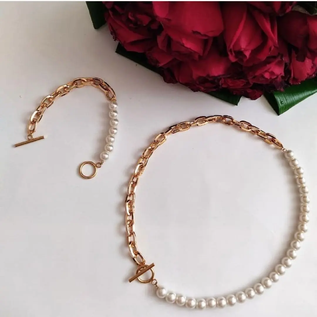ست گردنبند و دستبند بصورت ترکیبی از مروارید شل و زنجیر باگتی⛓️ و همینطور قفل تی و اتصالات استیل درست شده است. ست گردنبند و دستبند رنگ ثابت میباشد 💯 مناسب جهت هدیه دادن به عزیزانتان 🎁 مناسب خانم ها و دختران شیک پوش و خوش سلیقه 🙋🏻♀️👌