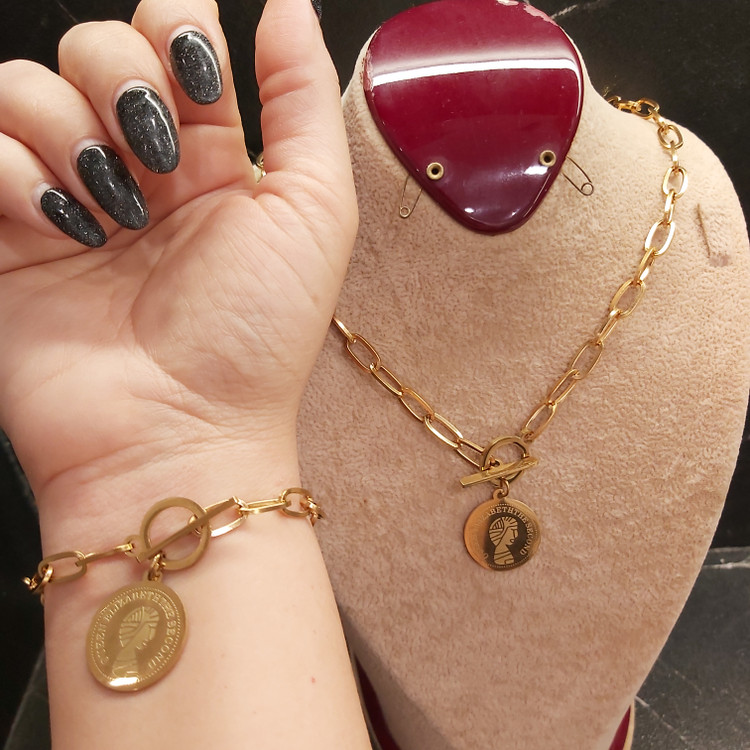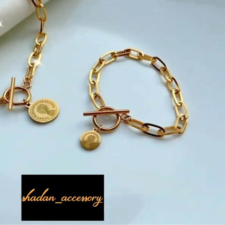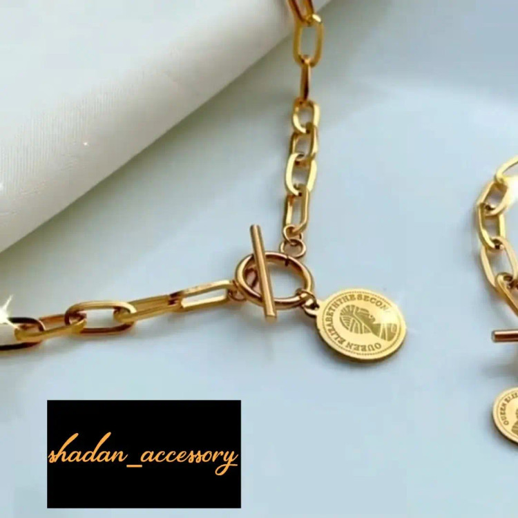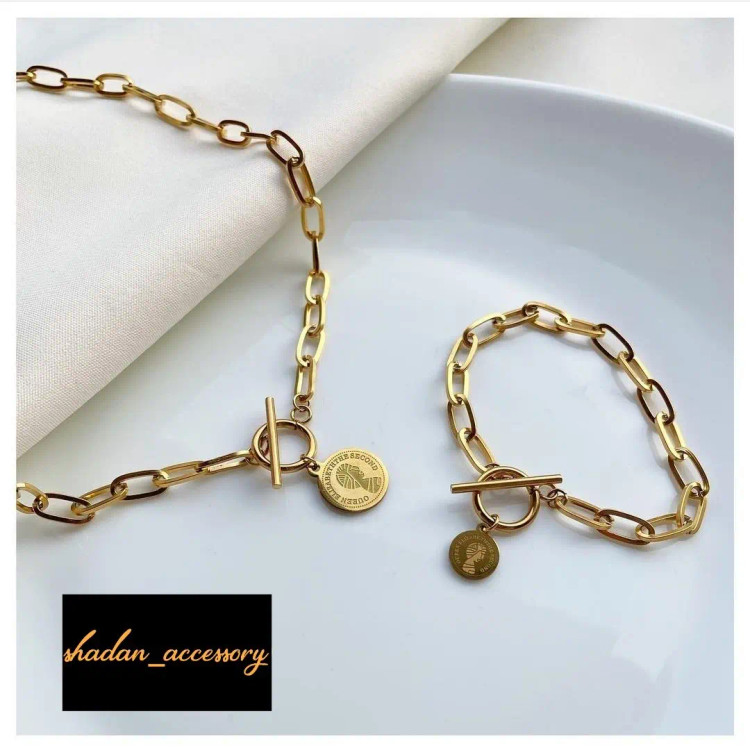 ست گردنبند و دستبند از زنجیر باگتی ⛓️ و قفل تی و سکه الیزابت و اتصالات استیل درست شده است که همگی رنگ ثابت میباشند. مناسب هدیه دادن 🎁 مناسب خانم ها و دختران شیک پوش و خوش سلیقه این روزا خیلی زیورآلات و اکسسوری های رنگ ثابت و استیل مد شده و مشابه طلا میباشد و مناسب استفاده روزمره 🚶🏻♀️و حتی میتونید باهاش حمام 🧖🏻♀️ و استخر 🏊🏻 هم برید.