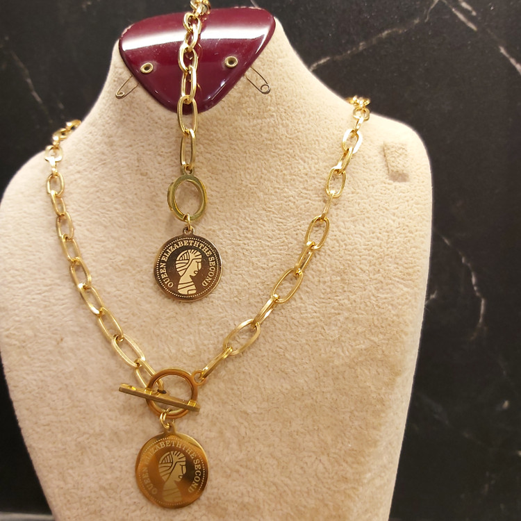 ست گردنبند و دستبند زنانه زنجیر باگتی و سکه الیزابت زیورآلات دستساز رنگ ثابت
