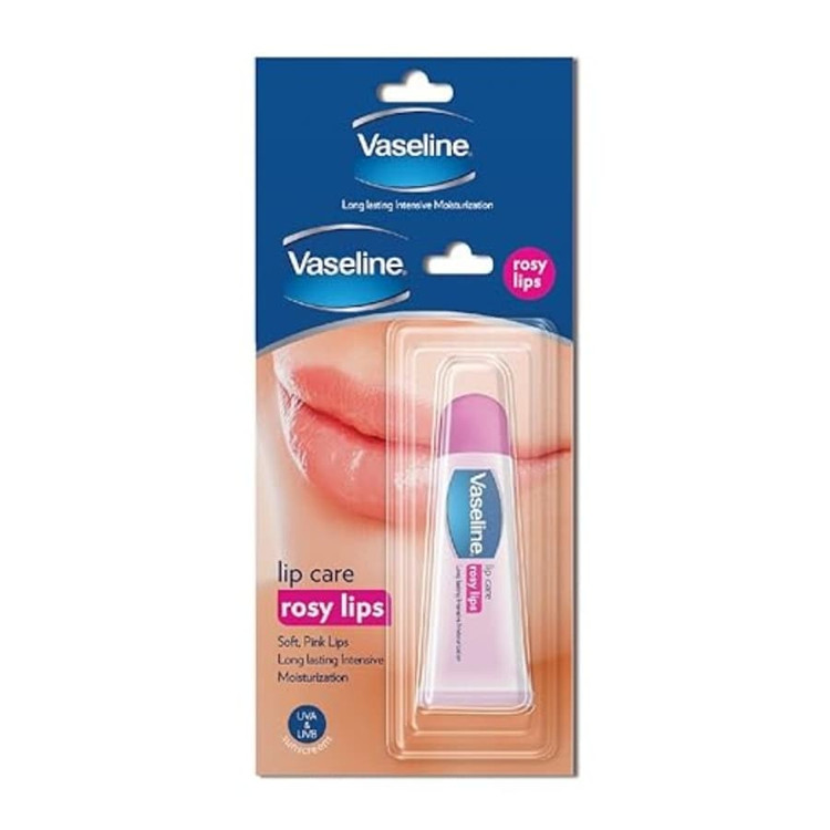 بالم لب تیوپی Rosy Lips وازلین کاملا پوست حساس لب ها را آبرسانی کرده و به تقویت و بازسازی ساختار آن می پردازد. بالم لب رنگ بسیار ملایم به لب ها می دهد و رایحه ی آن بسیار دل انگیز است. به طور کلی بالم لب های وازلین دارای فرمولاسیون بسیار مغذی وغنی از خواص درمانی پوست هستند. بالم لب رز وازلین با فاکتور های مراقبتی که دارد از پوست لب مقابل اشعه UVA و UVB محافظت میکند و با مرطوب کنندگی فشرده و طولانی مدت رطوبت را قفل می کند و به ترمیم لب های خشک، کدر و ترک خورده کمک می کند.این بالم لب وازلین رنگ صورتی کمرنگ و بسیار ملایمی دارد و لب ها را به شکل طبیعی درخشان و براق می کند