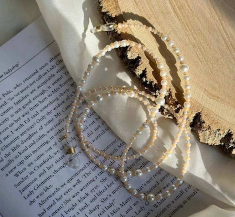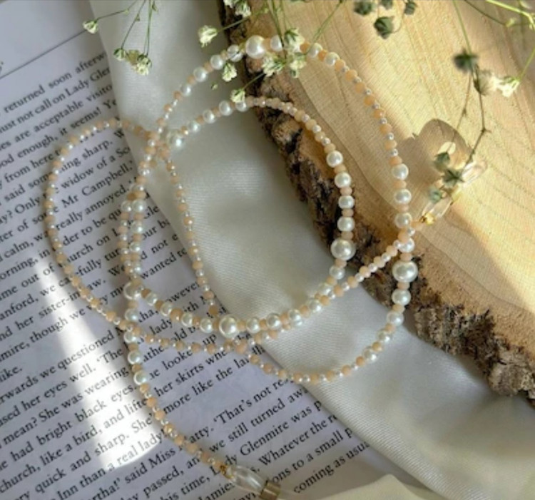 بند عینک از مروارید سنگی در سایزهای مختلف و کریستال کرمی و منجوق درست شده است.