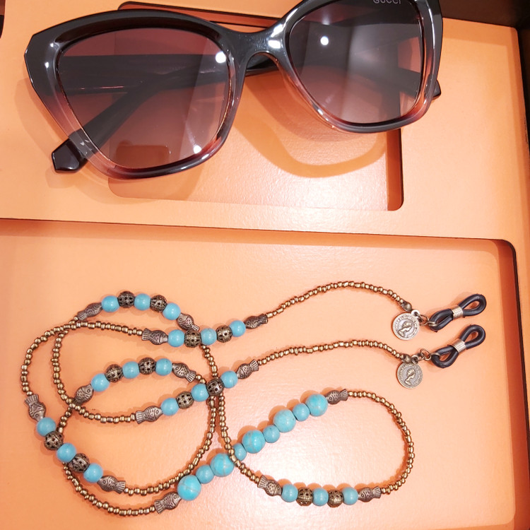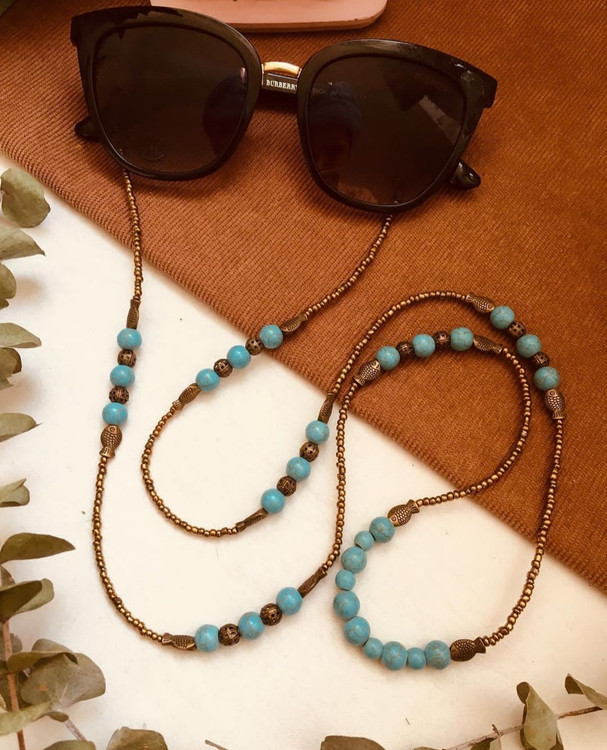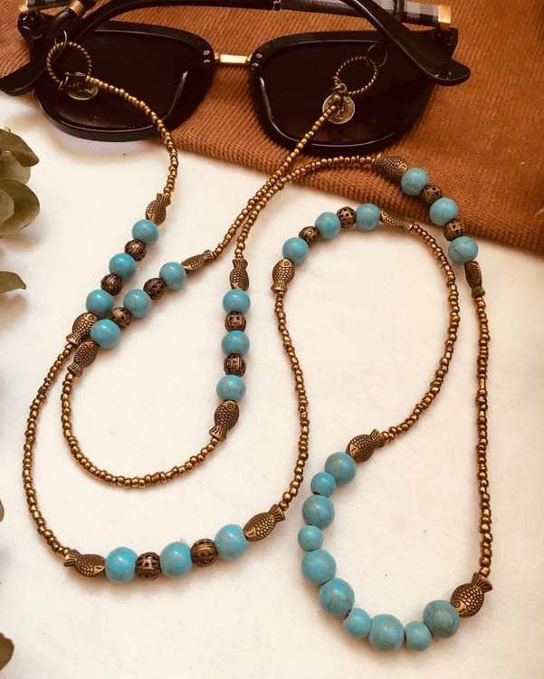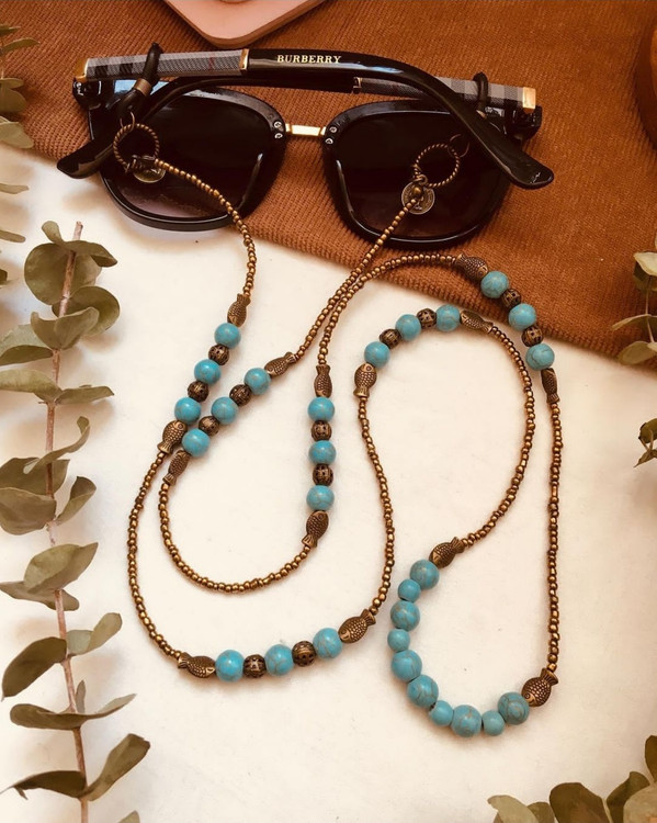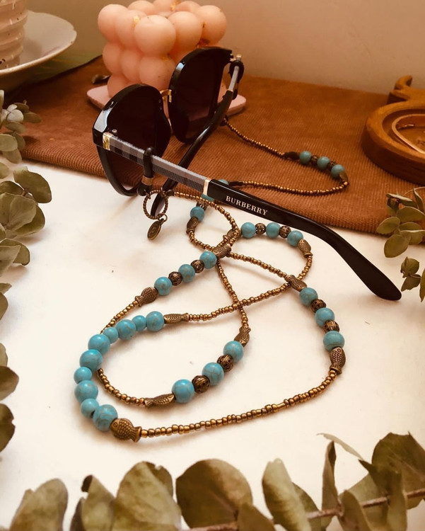 بند عینک از مهره های فیروزه در سایزهای مختلف و منجوق و خرجکار برنزی درست شده است.