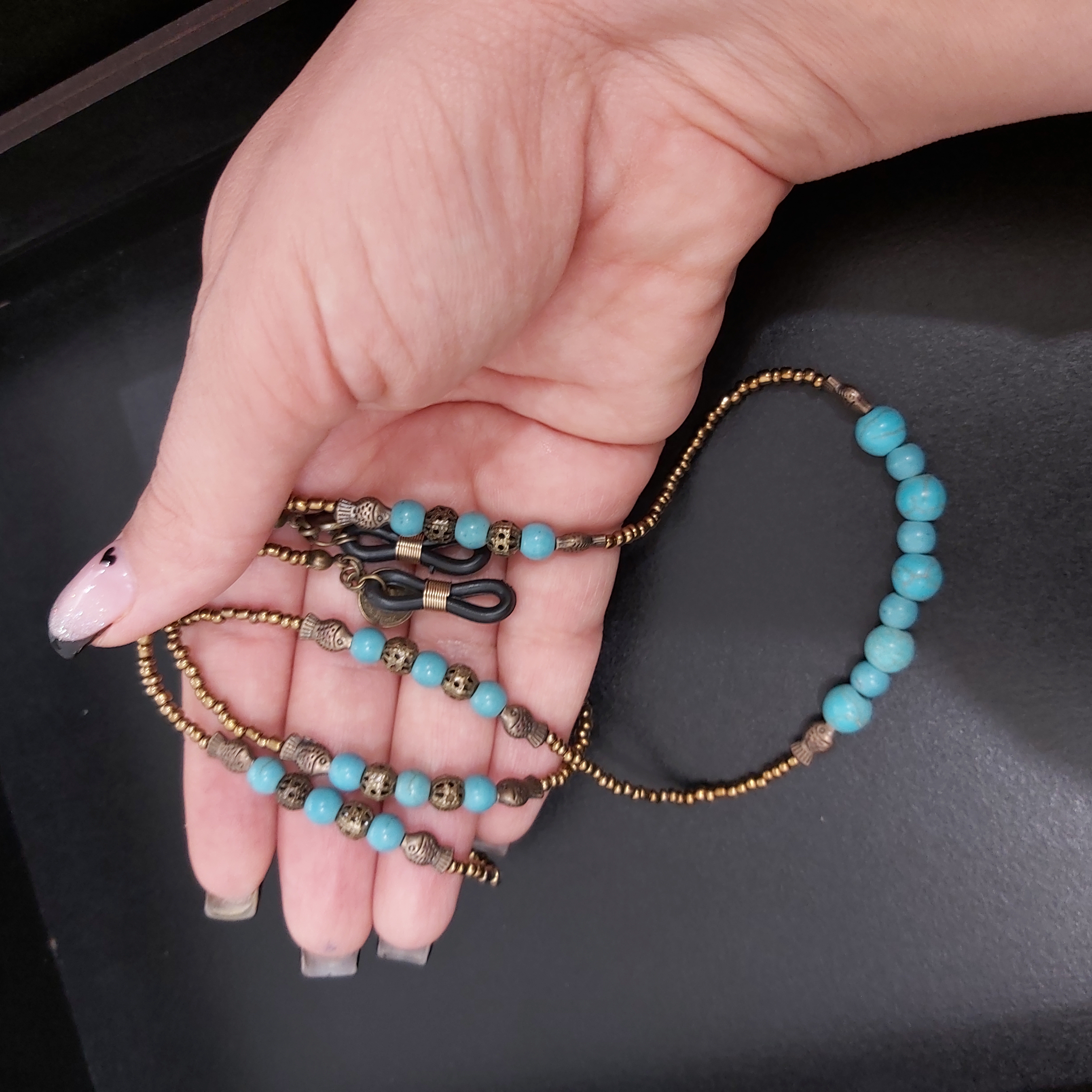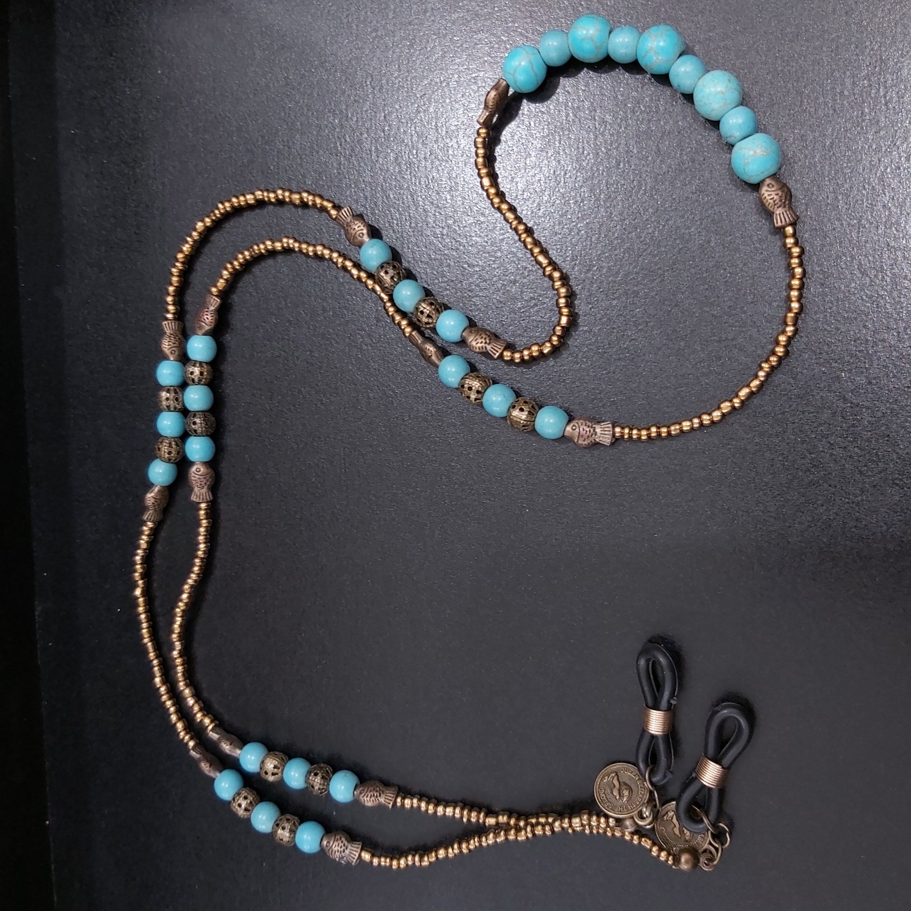 بند عینک از مهره های فیروزه در سایزهای مختلف و منجوق و خرجکار برنزی درست شده است.