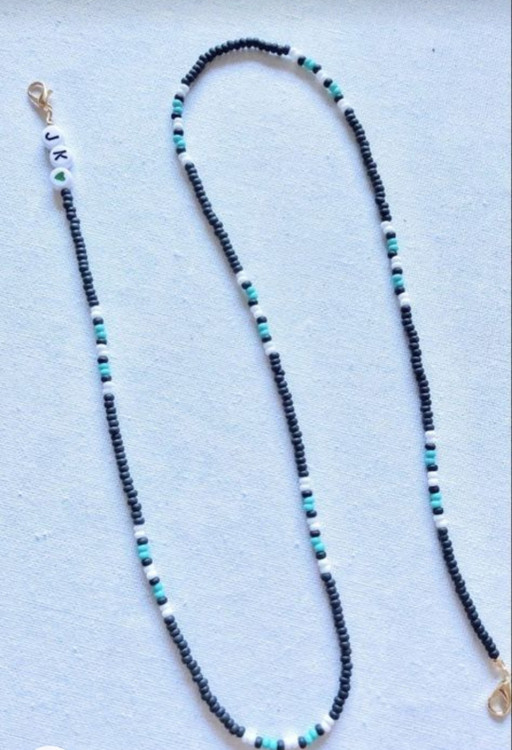 بند عینک از منجوق سیاه و سفید و فیروزه ای درست شده است.